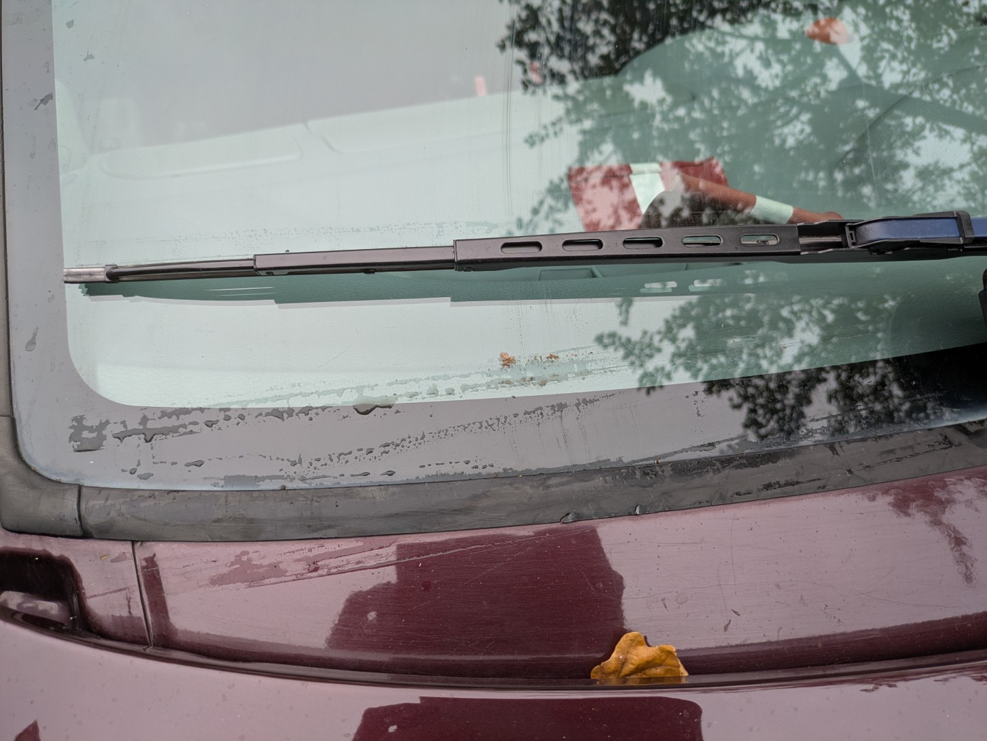 Pieregulēju arī priekšējo slotiņu, bija parāk zemu, līdz ar ko gāja virsū belķiem, arī jau dūrās tas gals pie asītes pret motora pārssegu, faktiski ķērās tas izliekums. Līdza ar to, protams, arī šofera pusē palika arī manāma nenoslaucīta josla kresiajā pusē. Cik zemu bija slotiņa, var redzēt pēc tās ūdens svītras uz metāla zem loga.