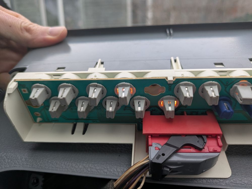 Man otrā mājā bija visādas rezerves daļas, aizbraucu tur, atrodu klimata regulatoru bloku, tur arī nav to lampiņu. Nedaudz saskumu jau. Parakņājos vēl, atradu indikatoru un tml. lampiņu paneli , tajā kādas 20 tādas